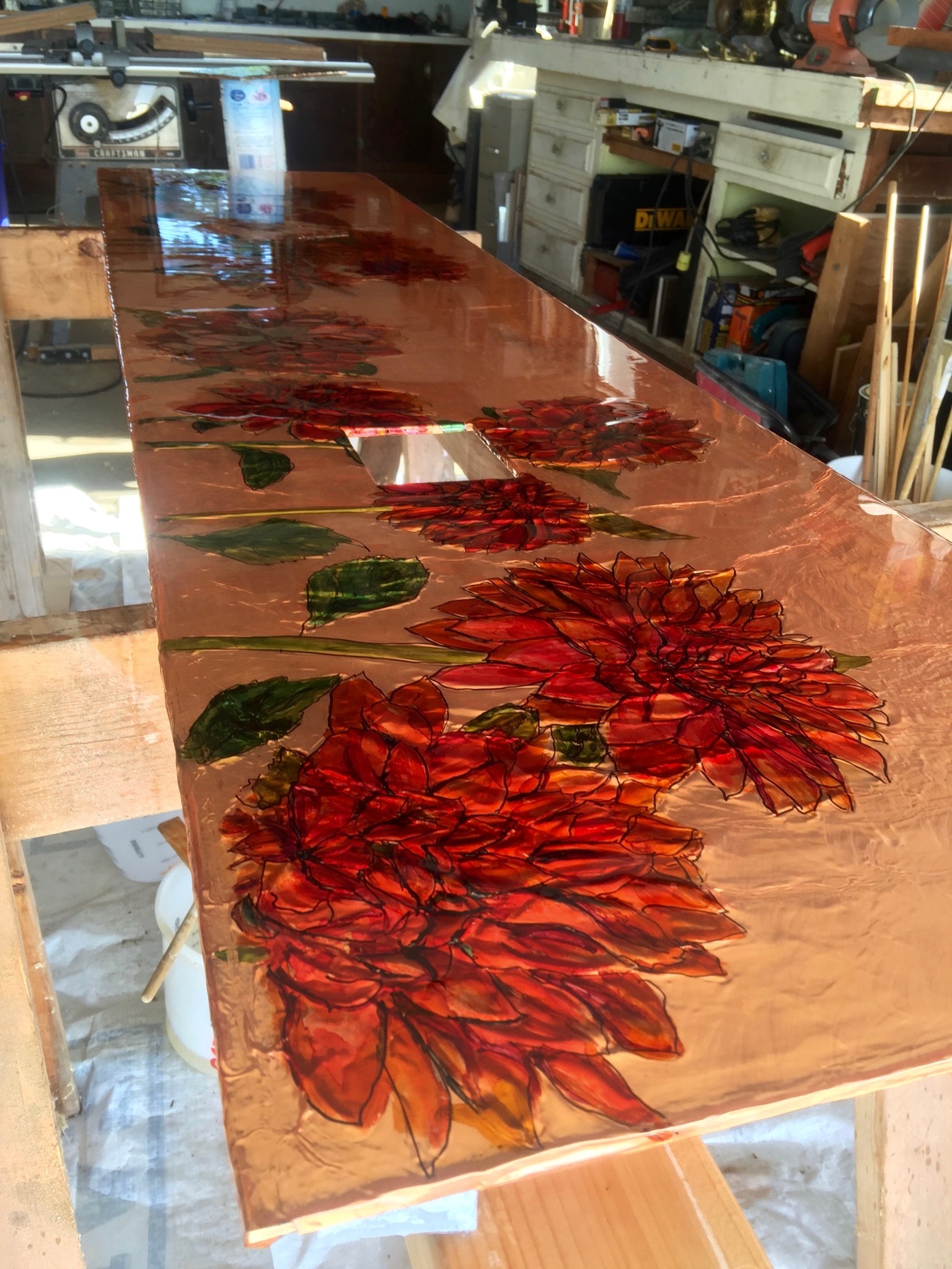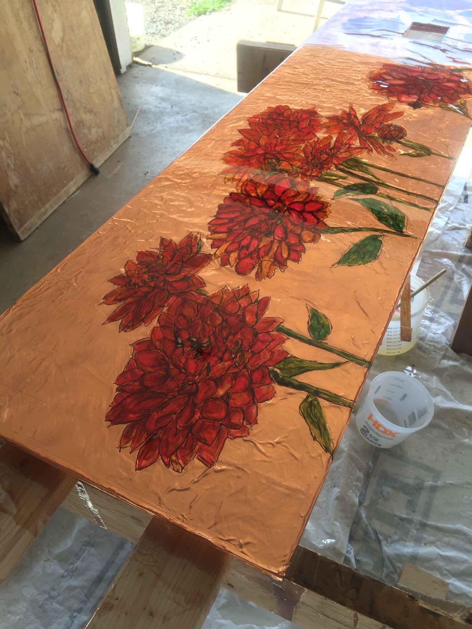 Update on the table…. table is sanded and painted, copper affixed to substrate and sealed… next comes the epoxy and we’re ready to be sold!