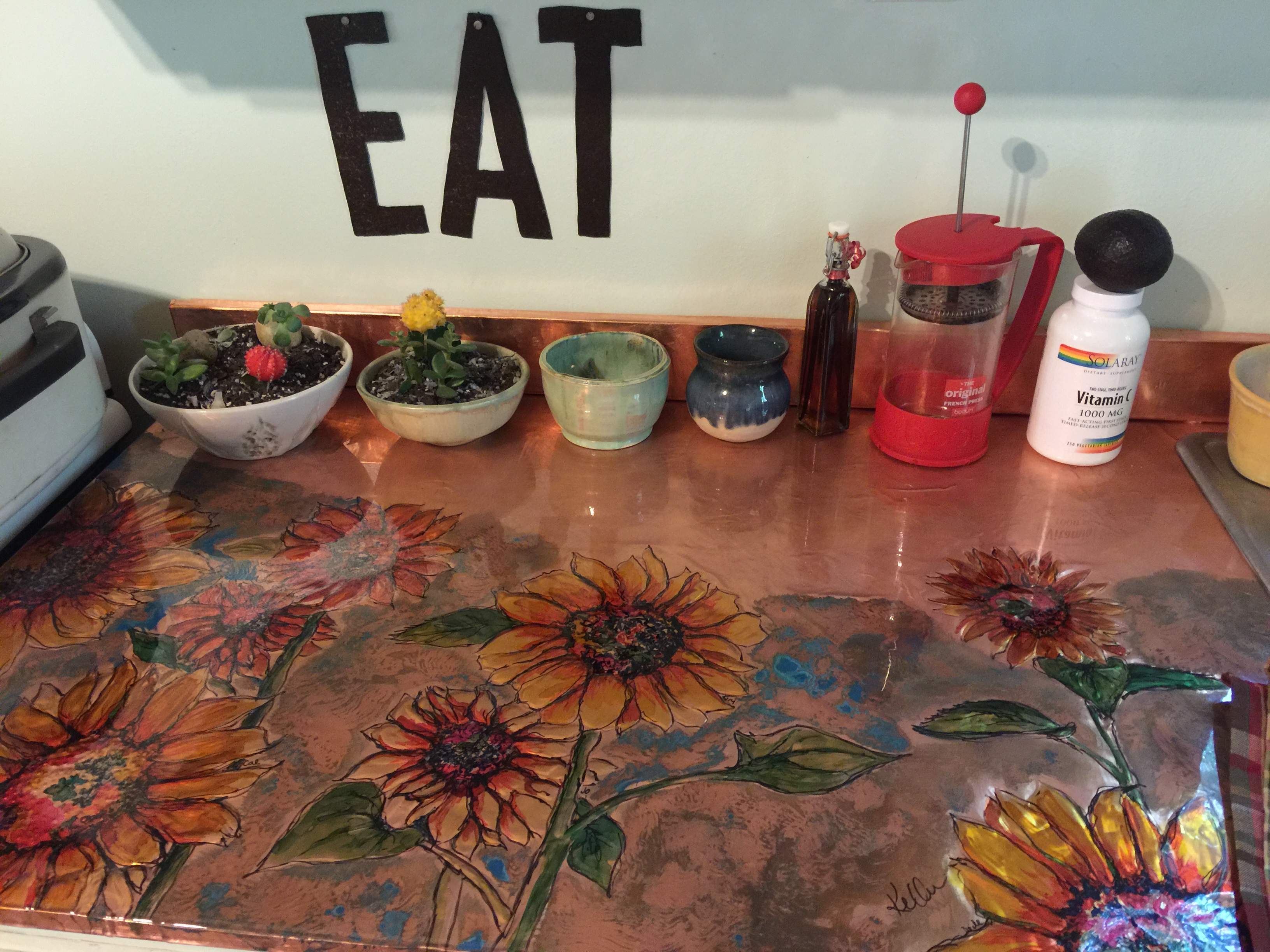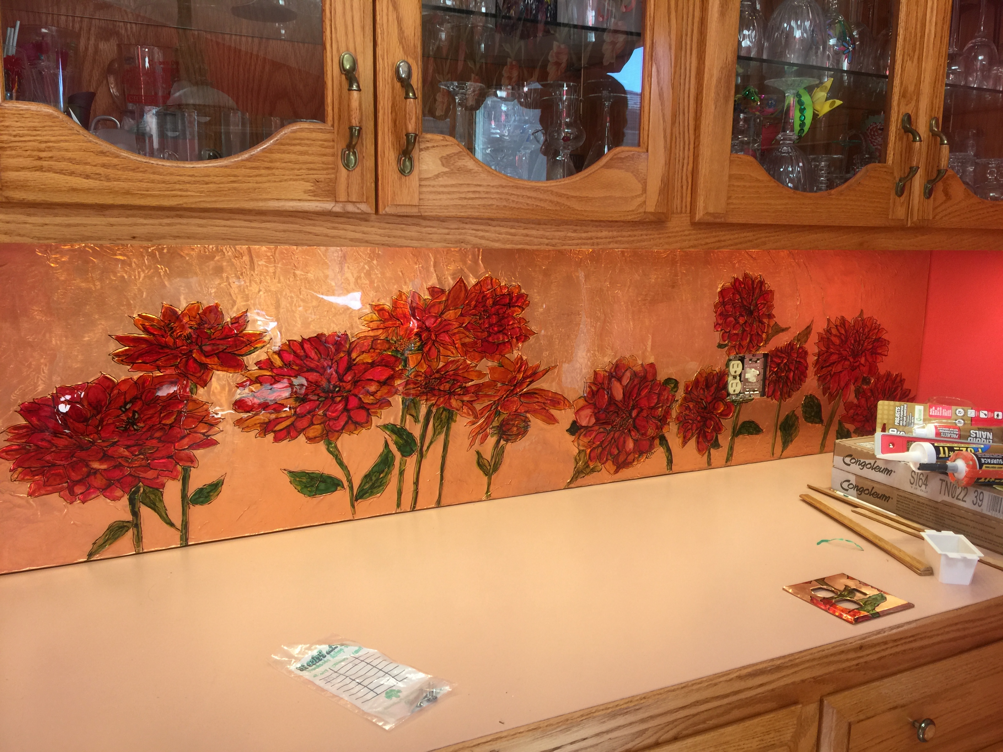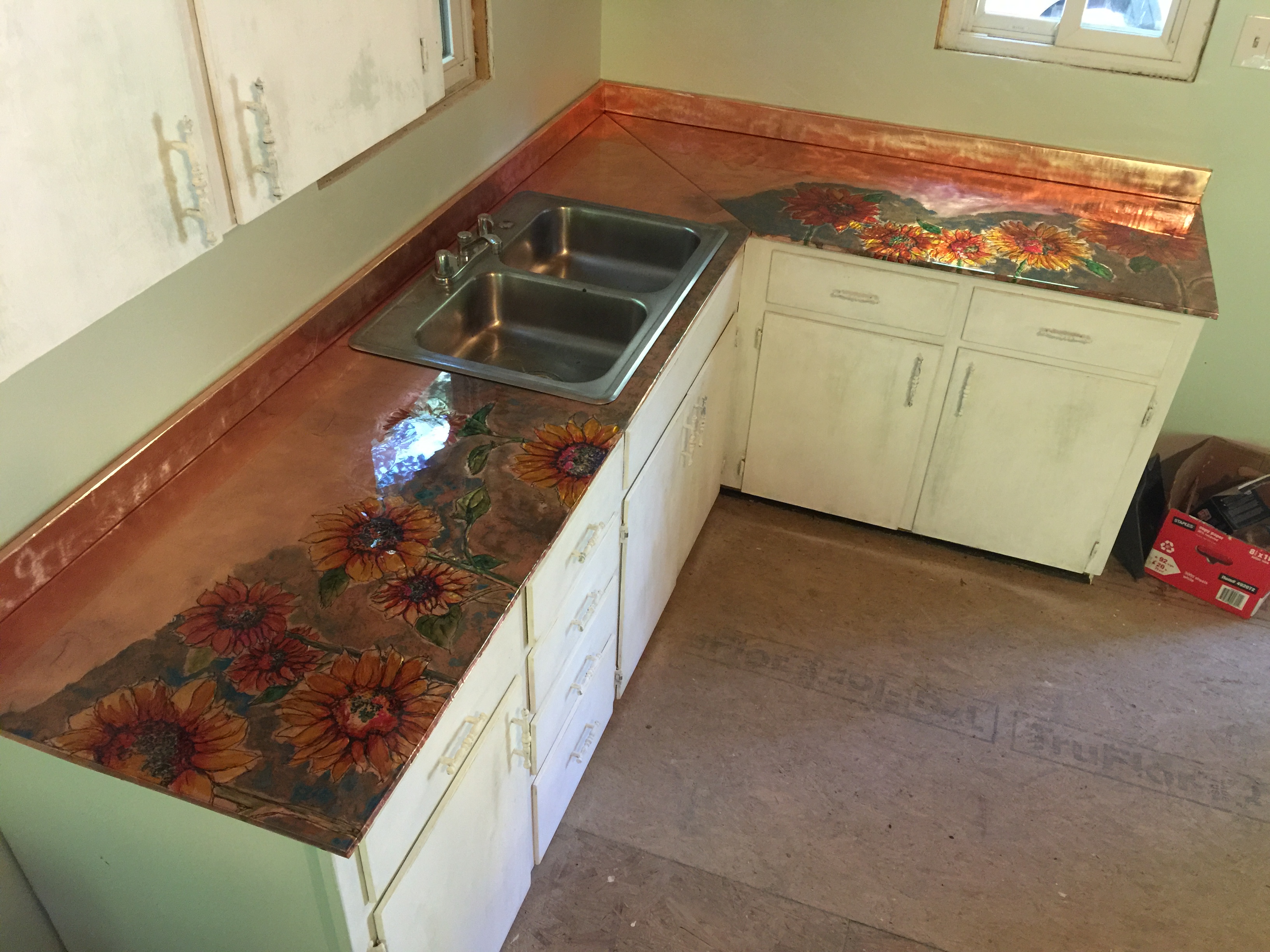 Another cabinet project: Sunflowers with poppies…. “here is a pic of the copper piece in our kitchen. Thank You again. It changed the mood of the kitchen and made it special.”